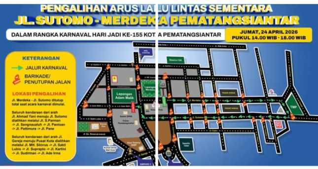 Pengalihan Arus Lalu Lintas saat Karnaval Hari Jadi ke-155 Kota Pematangsiantar, Jumat 24 April 2026